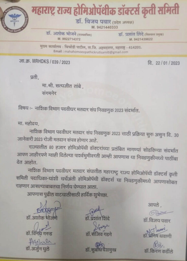 येत्या काळात राज्यातील 80 हजार होमिओपॅथी डॉक्टरांच्या प्रलंबित मागण्यां सोडविण्या संदर्भात सत्यजित तांबे यांच्या पुढाकाराने माजी आ. डॉ.सुधीर तांबे यांनी जाहीरपणे ग्वाही दिली असुन महाराष्ट्र राज्यातील होमिओपॅथि डॉक्टरांच्या कृती समितीच्या वतीने नाशिक विभाग पदवीधर मतदार संघ निवडणुकीसाठी जाहीर पाठींबा दर्शवत. नाशिक विभाग पदवीधर मतदार संघातील महाराष्ट्र राज्य होमिओपॅथी डॉक्टर्स कृती समिती या निवडणुकीमध्ये आपणासोबत राहणार आसल्याबाबतचा निर्णय घेण्यात आला असुन पुढील वाटचालीसाठी शुभेच्छा देण्यात आल्या.