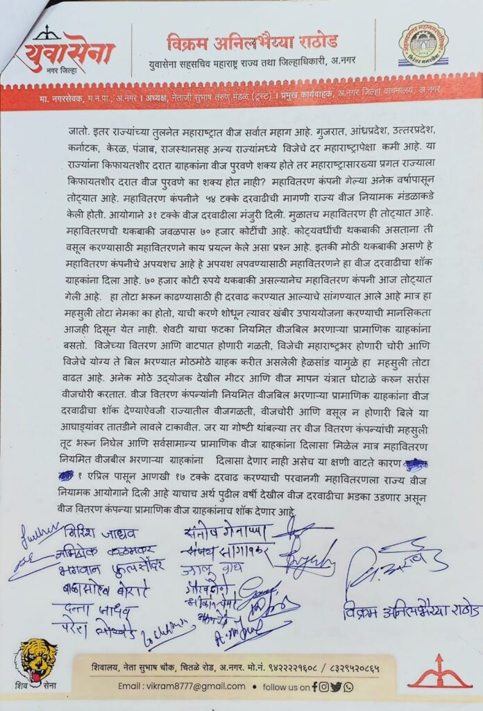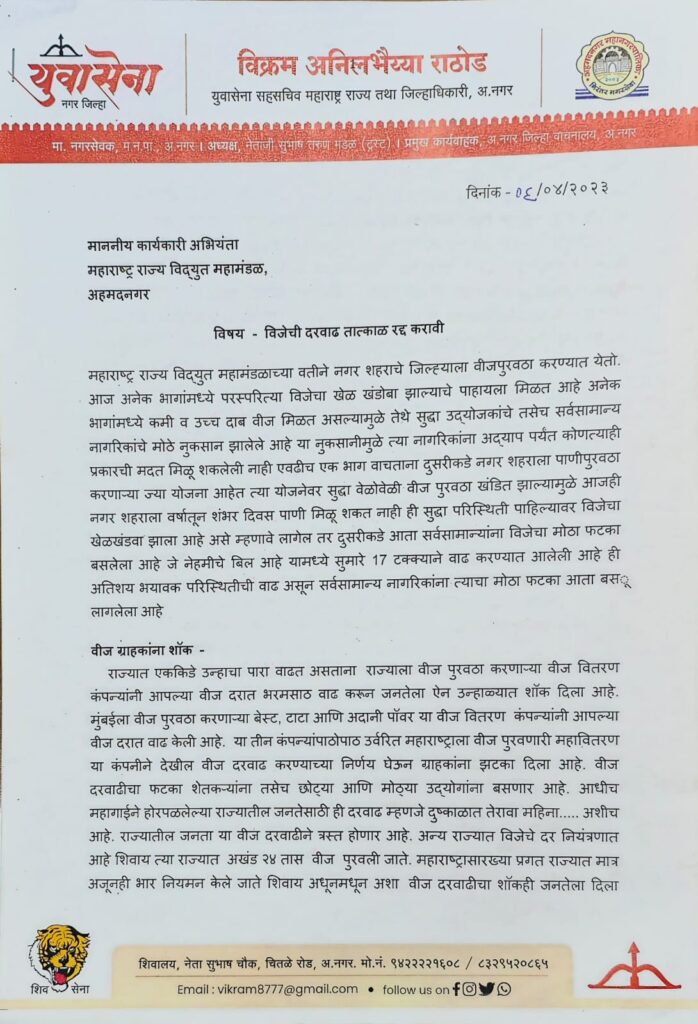 महाराष्ट्र राज्य विद्युत महामंडळाच्या वतीने नगर शहराचे जिल्ह्याला वीजपुरवठा करण्यात येतो. आज अनेक भागांमध्ये परस्परित्या विजेचा खेळ खंडोबा झाल्याचे पाहायला मिळत आहे अनेक भागांमध्ये कमी व उच्च दाब वीज मिळत असल्यामुळे तेथे सुद्धा उद्योजकांचे तसेच सर्वसामान्य नागरिकांचे मोठे नुकसान झालेले आहे या नुकसानीमुळे त्या नागरिकांना अद्याप पर्यंत कोणत्याही प्रकारची मदत मिळू शकलेली नाही एवढीच एक भाग वाचताना दुसरीकडे नगर शहराला पाणीपुरवठा करणाऱ्या ज्या योजना आहेत त्या योजनेवर सुद्धा वेळोवेळी वीज पुरवठा खंडित झाल्यामुळे आजही नगर शहराला वर्षातून शंभर दिवस पाणी मिळू शकत नाही ही सुद्धा परिस्थिती पाहिल्यावर विजेचा खेळखंडवा झाला आहे असे म्हणावे लागेल तर दुसरीकडे आता सर्वसामान्यांना विजेचा मोठा फटका बसलेला आहे जे नेहमीचे बिल आहे यामध्ये सुमारे 17 टक्क्याने वाढ करण्यात आलेली आहे ही अतिशय भयावक परिस्थितीची वाढ असून सर्वसामान्य नागरिकांना त्याचा मोठा फटका आता बसू लागलेला आहे